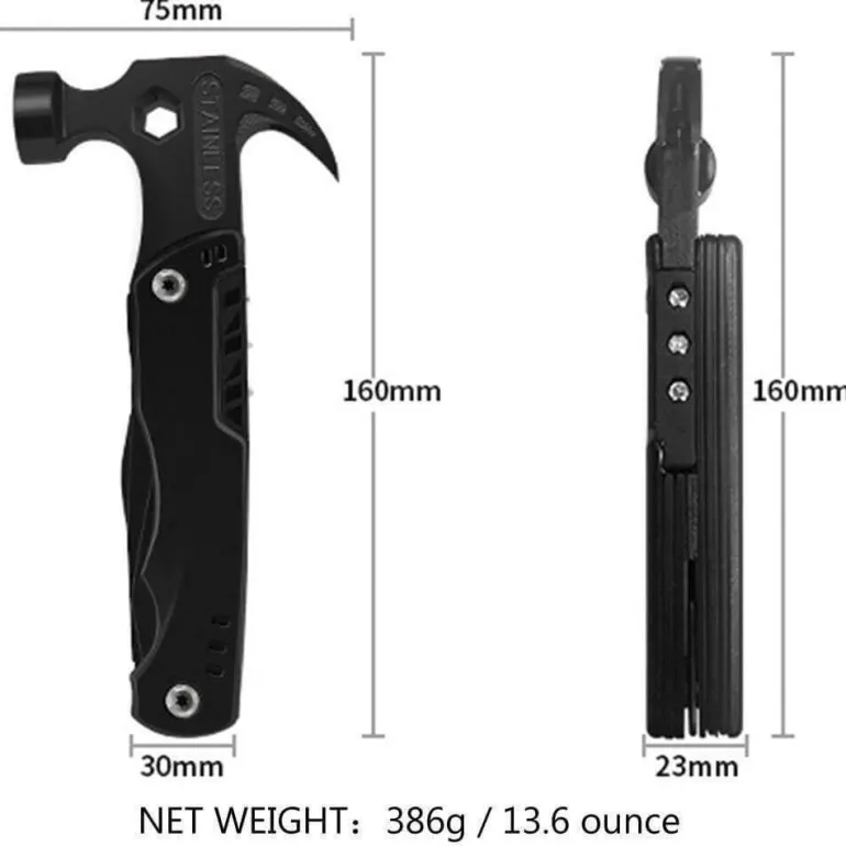 Zu den wichtigsten Funktionen gehören ein Hammer zum Einschlagen von Nägeln, ein scharfes Messer zum Schneiden und eine robuste Säge für die Holzbearbeitung. Mit dem praktischen Dosenöffner können Sie bequem an Ihre Lebensmittel gelangen, während große und kleine Sechskantschlüssel vielseitige Anwendungsmöglichkeiten bieten. Der Korkenzieher bietet zudem eine praktische Lösung zum Öffnen von Flaschen, und die Klemme bietet sicheren Halt für verschiedene Aufgaben. Eine robuste Zange erleichtert das Greifen und Biegen, während sich eine Schneidzange perfekt für die Handhabung von Draht und härteren Materialien eignet. Der Schraubendreherkopf eignet sich für Befestigungselemente, und der Nagelzieher vereinfacht das Entfernen von Nägeln.