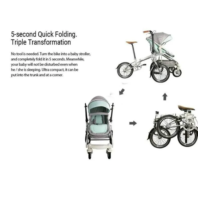 Zusammengeklappt misst das kompakte Design nur 80 x 65 x 42 cm (31,5 x 25,59 x 16,54 Zoll) und lässt sich so problemlos in U-Bahnen oder Hochgeschwindigkeitszügen mitnehmen. Das Fahrrad lässt sich mühelos und ohne Werkzeug zusammen- und auseinanderklappen, sodass Ihr schlafendes Baby beim Übergang ungestört bleibt.