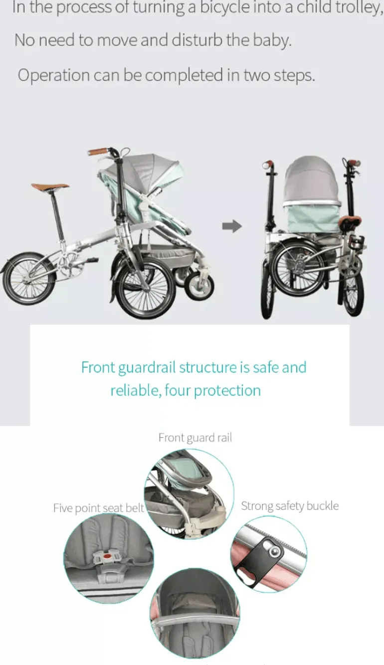 Entdecken Sie das innovative Design unseres 2-in-1-Kinderwagenfahrrads – eine vielseitige Lösung, die sich mühelos vom Faltrad in eine vierrädrige Babytrage verwandelt. Das Fahrrad verfügt über einen schnellen 5-Sekunden-Klappmechanismus und lässt sich so einfach verstauen und transportieren. Es ist der perfekte Begleiter für Eltern, die mit ihren Kleinen die Natur erkunden möchten. Es bietet Kindern eine wunderbare Gelegenheit, die Natur zu erleben und gleichzeitig eine ruhige und sichere Fahrt zu genießen.