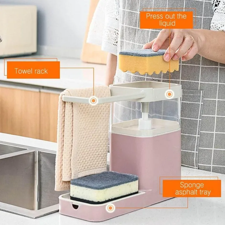 Dank des praktischen Pressmechanismus lässt sich das Reinigungsmittel mühelos dosieren – so erledigen Sie Ihre Reinigungsaufgaben mit nur einer Hand. Der integrierte Handtuchhalter macht den Waschmittelspender noch praktischer und bietet Platz zum Aufhängen Ihrer Geschirrtücher zum schnellen Trocknen.