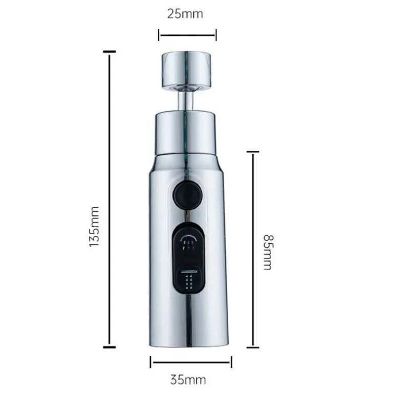 Dieser Wasserhahnadapter besteht aus robusten Materialien wie Kupfer und hochwertigem ABS und ist für eine lange Lebensdauer ausgelegt. Mit Abmessungen von 135 x 35 x 85 mm (5,31 x 1,38 x 3,35 Zoll) passt er nahtlos auf die meisten Standard-Küchenarmaturen.