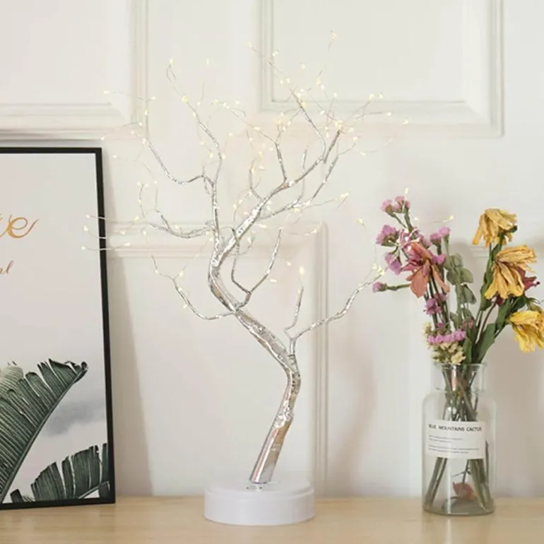 Built with a sturdy base and a convenient USB plug, this versatile lamp is perfect for both indoor and outdoor use. It operates on 3 AA batteries (not included) and features adjustable branches, allowing you to bend and shape them as desired to mimic the natural elegance of a tree.