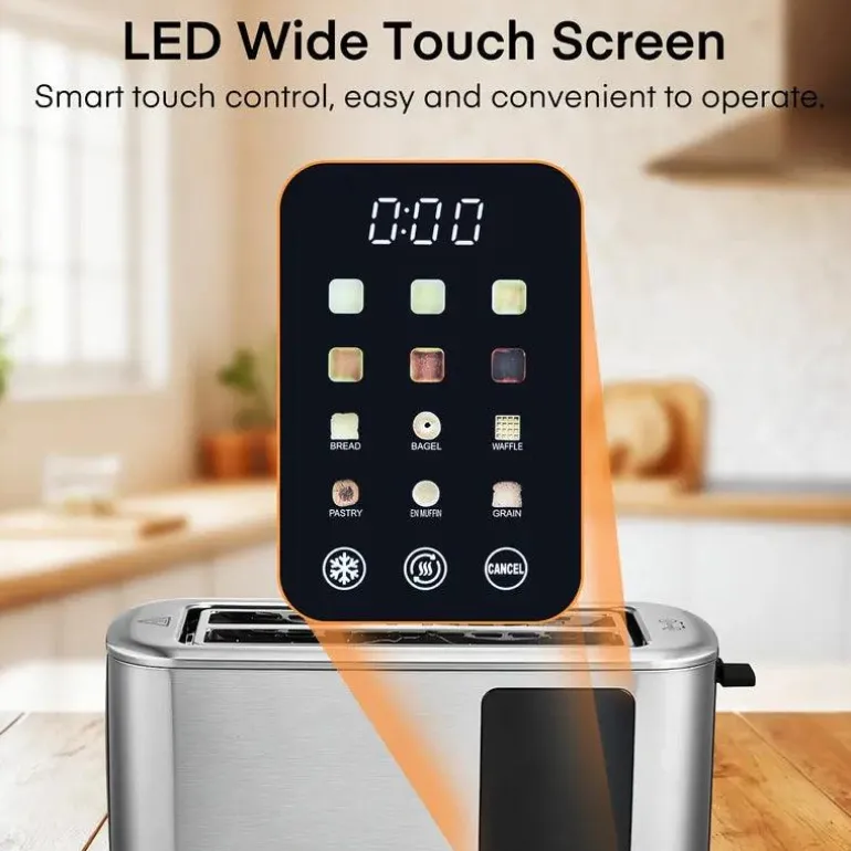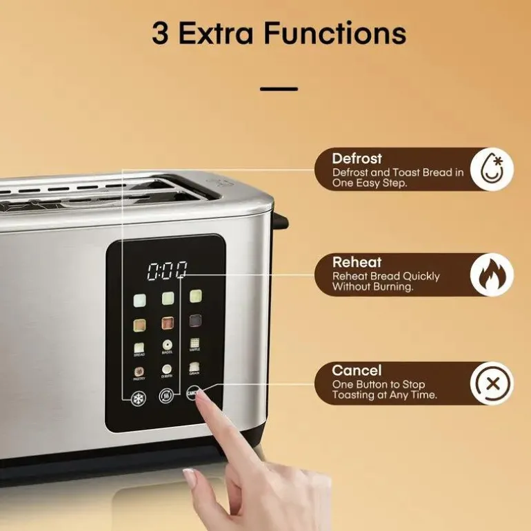 Mit diesem 4-Scheiben-Toaster mit Touchscreen-Steuerung zaubern Sie jedes Mal perfekten Toast. Er bietet Präzision und Vielseitigkeit in Ihrer Küche. Ob Bagels, dickes Brot oder handwerklich geröstete Scheiben – die extra breiten Schlitze und die einstellbaren Einstellungen ermöglichen es Ihnen, Ihren Toast ganz nach Ihren Wünschen zu gestalten.