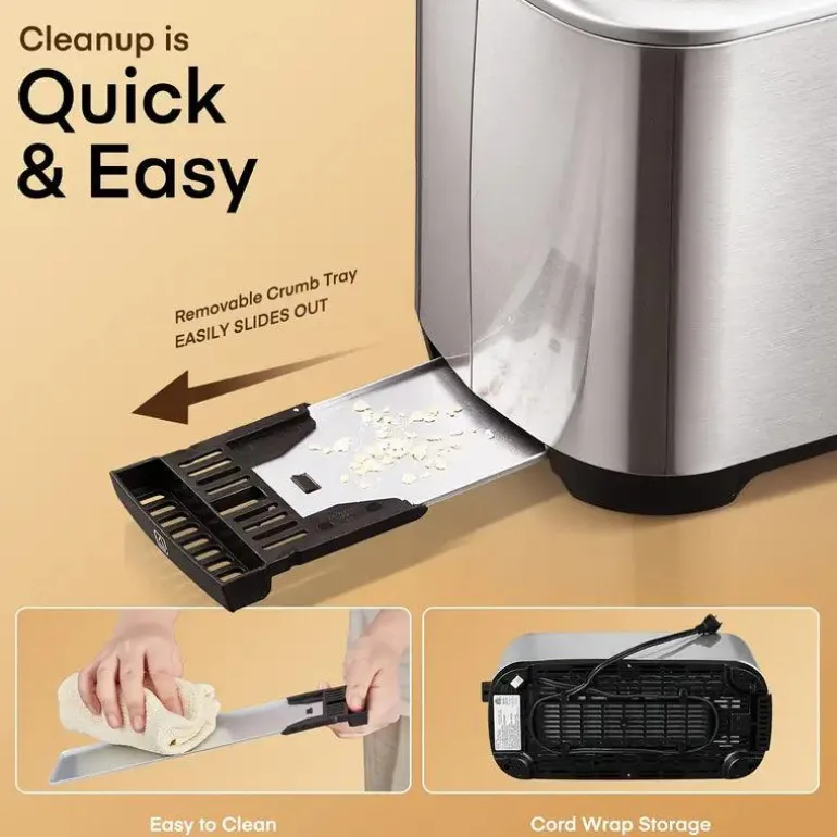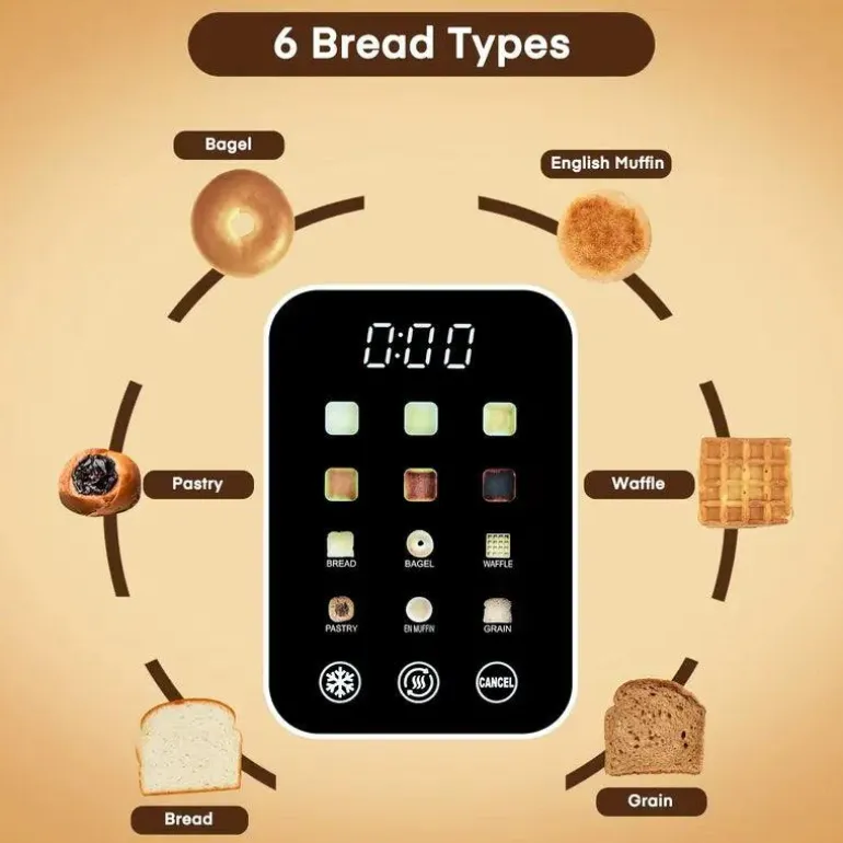 – Wählen Sie aus 6 Brotsorten (z. B. Weißbrot, Vollkornbrot, Bagel) und 6 Bräunungsstufen für jedes Mal den perfekten Toast. - Extrabreite Schlitze