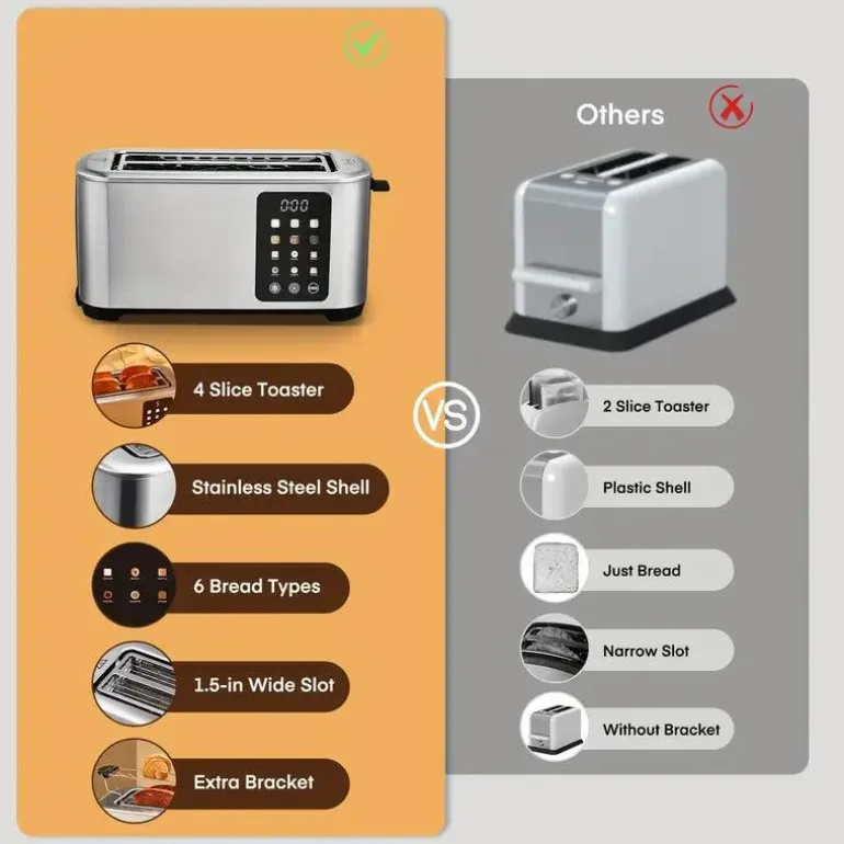 Dieser 4-Scheiben-Smart-Toaster ist perfekt für geschäftige Morgen oder entspannte Wochenenden. Er bringt Komfort und Stil in Ihre Küche und macht es einfacher, Ihre Lieblings-Toastsnacks präzise und einfach zu genießen.
