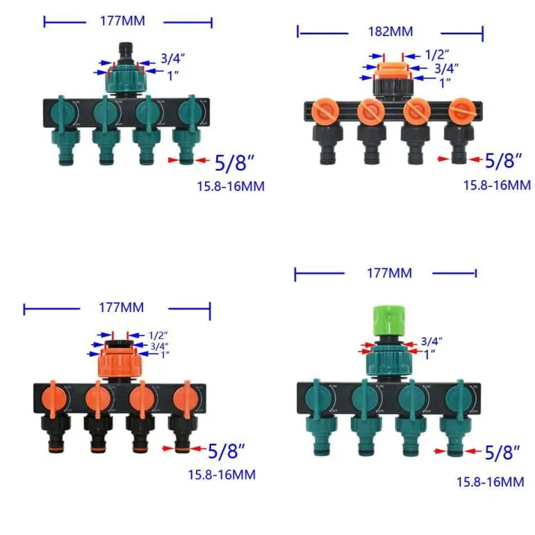 Ausgestattet mit einem Anschlussgewinde für die Größen 1/2″, 3/4″ und 1″ verfügt dieser Verteiler über einen 5/8-Zoll-Schnellanschluss für einfache Einrichtung und Verwendung. Sein robustes Design sorgt für Langlebigkeit und bietet gleichzeitig vier Auslässe, um das Wasser genau dorthin zu verteilen, wo es benötigt wird.