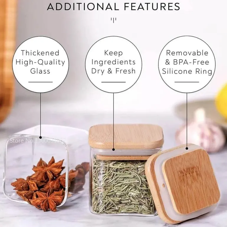 Diese vielseitigen Gläser eignen sich zum Aufbewahren verschiedenster Lebensmittel. Von den reichhaltigen, aromatischen Noten von Kaffeebohnen bis hin zum wohltuenden Duft von Teeblättern – jedes Glas sorgt dafür, dass Ihre Lieblingszutaten frisch bleiben und schön präsentiert werden. Mit ihrem schicken Bambusdeckel verleihen diese Gläser Ihrer Küche einen Hauch natürlicher Eleganz.