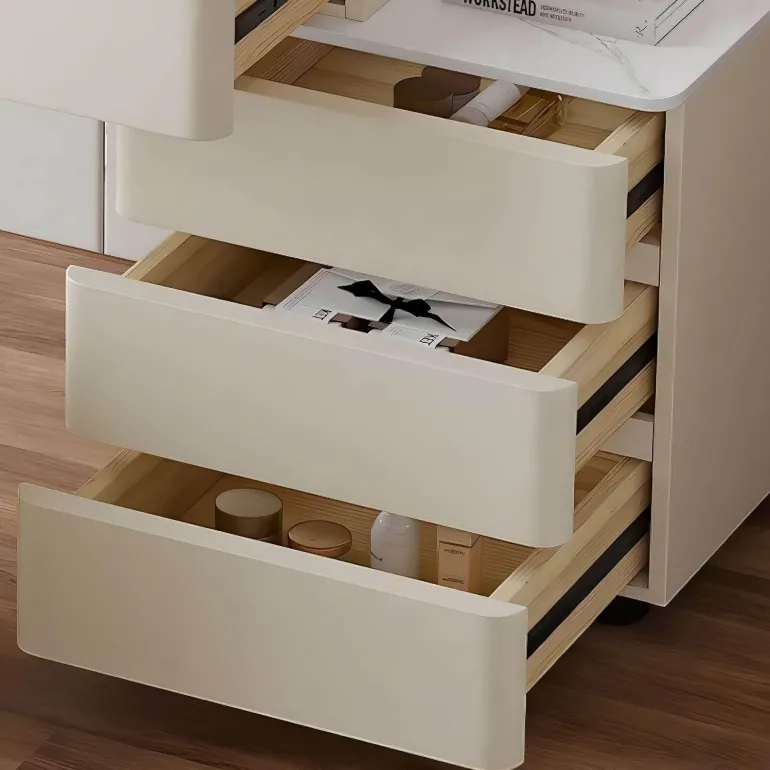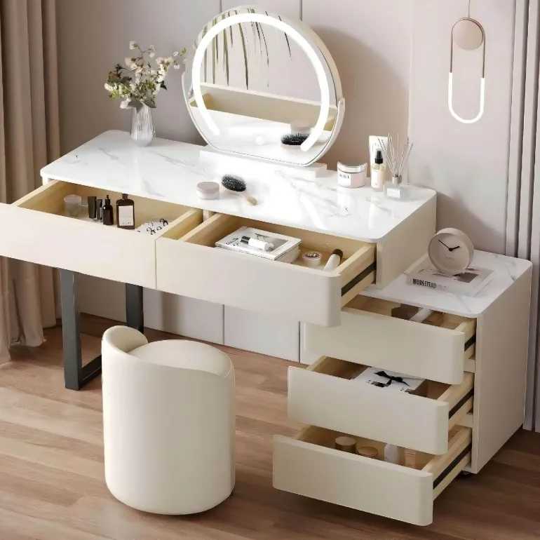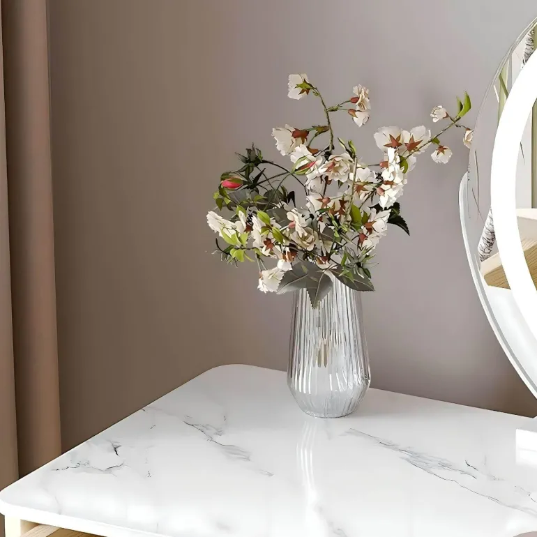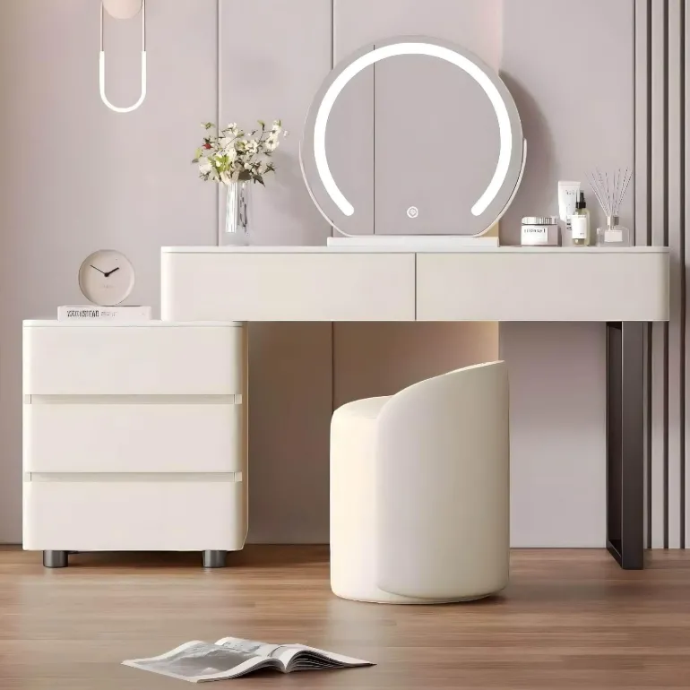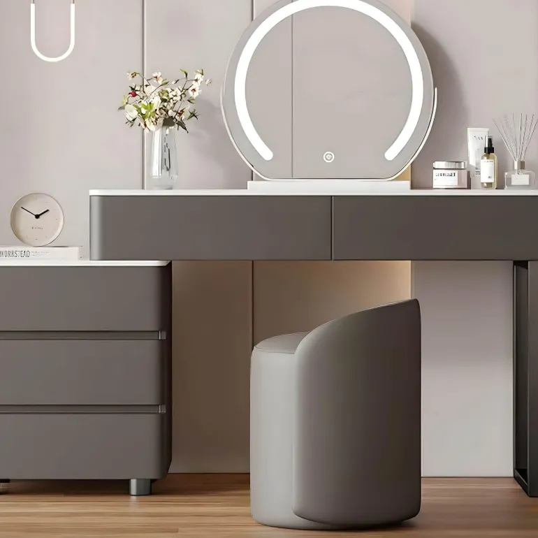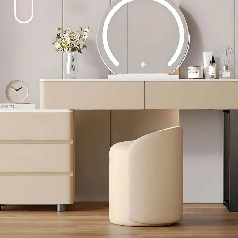 Dieser praktische Schminktisch verfügt über mehrere Schubladen und Fächer, sodass Make-up und Accessoires gut organisiert und leicht zugänglich sind. Er ist die ideale Ergänzung für jedes Schlafzimmer oder Ankleidezimmer und dient nicht nur als funktionales Möbelstück, sondern auch als stilvolle Bereicherung. Perfekt für alle, die ihre persönliche Pflege verbessern möchten, passt dieser Schminktisch sowohl zu traditionellen als auch zu modernen Einrichtungen.