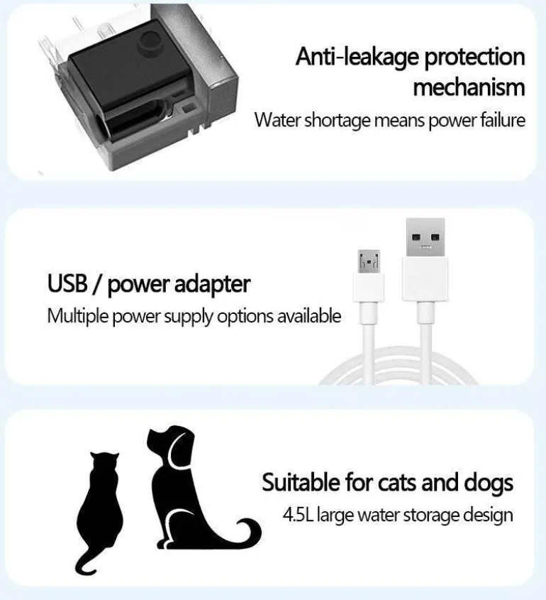 Mit seinem großzügigen 4,5-Liter-Wassertank bietet dieser Brunnen reichlich Frischwasser für bis zu sieben Tage und ist damit die ideale Wahl für vielbeschäftigte Tierhalter. Sein leiser Betrieb mit unter 40 dB sorgt für eine ruhige Umgebung für Sie und Ihre Haustiere – perfekt für gemeinsame Momente.