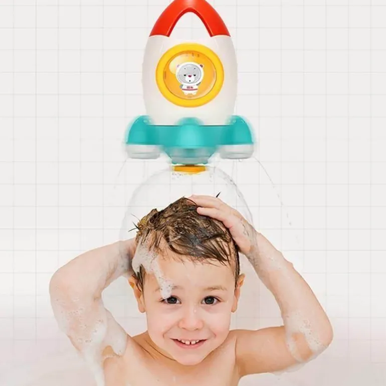 Erwecken Sie Ihr Kind mit unserem Baby-Baderaketen-Sprühspielzeug zum fantasievollen Spielen – ideal für lustige Wasserabenteuer. Tauchen Sie die Rakete einfach ins Wasser, um sie zu füllen, heben Sie sie dann heraus und beobachten Sie, wie sich der Boden dreht, während hydrodynamische Kräfte einen spielerischen Flammeneffekt erzeugen, der an einen Raketenstart erinnert.
