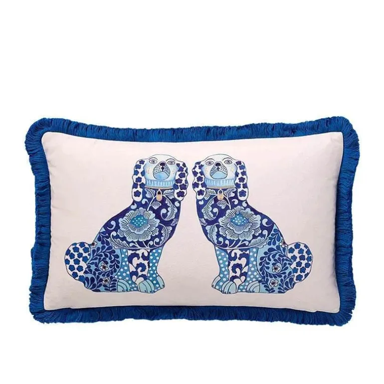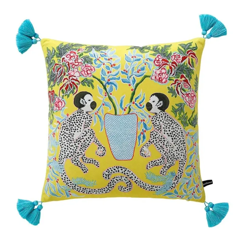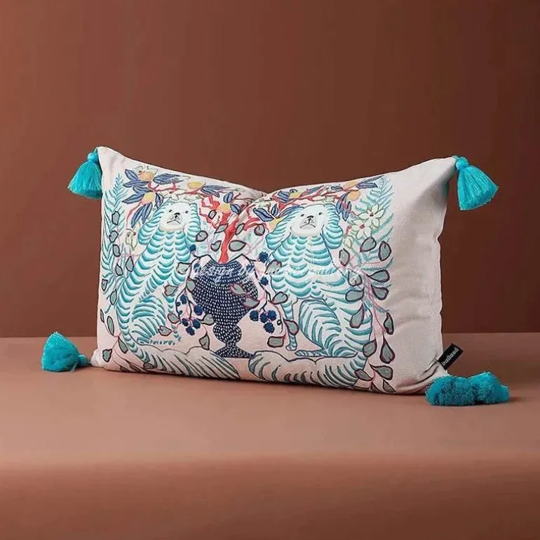 Verwandeln Sie Ihre Umgebung mit dem blauen Kissenbezug mit Löwenhund und Zitronenbäumen in einen gemütlichen Rückzugsort. Dieses Stück vereint Stil, Komfort und Umweltbewusstsein und wertet Ihre Einrichtung mit seinem künstlerischen Charme auf.