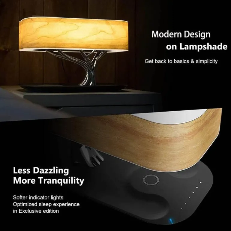Combining three essential functions—wireless charging, Bluetooth speaker, and desk lamp—the Tree of Light is a versatile addition to any home. Its natural, stepless dimming function, filtered through the warm cherry wood shade, creates a cozy atmosphere that enhances your living space.