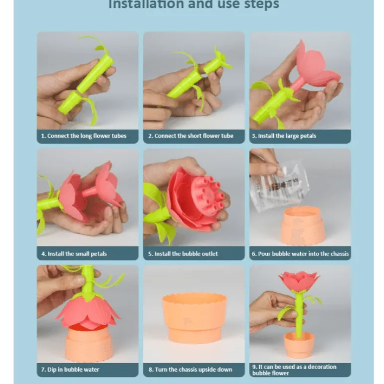 Der Blumen-Seifenblasenmacher fördert mit seinen abnehmbaren und individuell anpassbaren Blumenkomponenten die Kreativität Ihres Kindes und fördert dessen praktische Fähigkeiten und Fantasie. Die Seifenblasenherstellung ist ganz einfach: Tauchen Sie den Stab in die Seifenblasenlösung und pusten Sie, um einen magischen Strom von Seifenblasen freizusetzen, die in die Luft schweben, Kinder fesseln und sie in eine fantasievolle Traumwelt entführen.