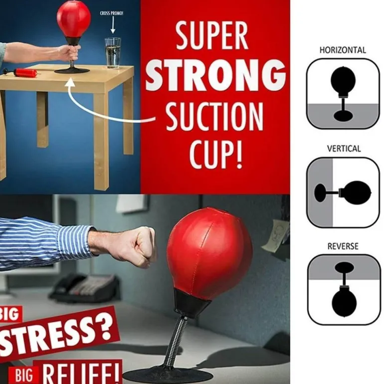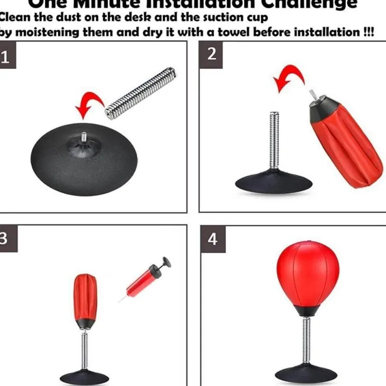 Dank des breiten Saugnapfs, der sicher auf jeder flachen, sauberen und trockenen Oberfläche haftet, ist der Aufbau Ihres Tischboxsacks kinderleicht. Die langlebige Hochdruckfeder sorgt bei jedem Schlag für einen angenehmen Rückstoß und macht jeden Schlag zum Vergnügen. Der Aufbau geht schnell und ohne Werkzeug, sodass Sie in Sekundenschnelle mit Ihrem Stressabbau-Training beginnen können.