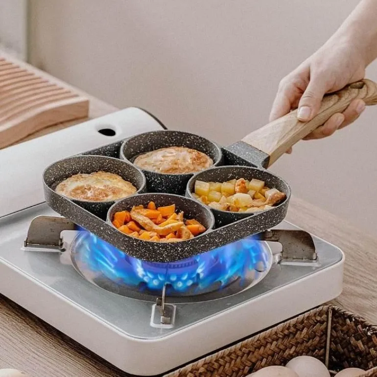 Mit vier Fächern eignet sich diese multifunktionale Pfanne perfekt für die Zubereitung von Omeletts, Burgern und mehr und ermöglicht Ihnen die schnelle und effiziente Zubereitung köstlicher Mahlzeiten.