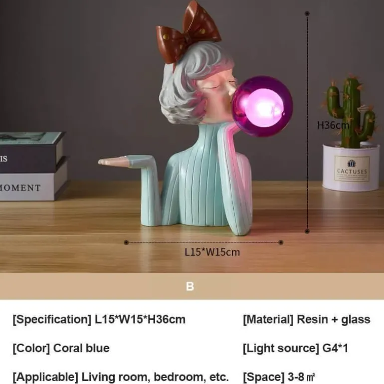 Verschönern Sie Ihren Wohnraum mit der farbenfrohen Harz-Tischlampe, einem schicken und raffinierten Stück, das Ihre Einrichtung perfekt ergänzt. Ihr einzigartiges Bubble-Girl-Design macht diese moderne Nachttischlampe zu einem charmanten Blickfang, ideal für Schlafzimmer und Wohnzimmer.