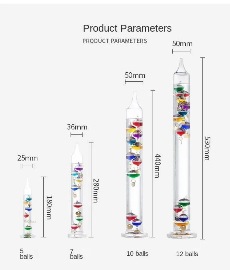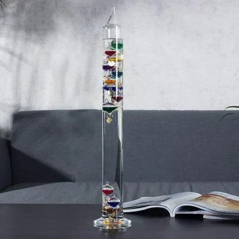 Bei Temperaturschwankungen schwimmt oder sinkt jede Glaskugel in der flüssigkeitsgefüllten Kammer. So lässt sich die aktuelle Temperatur bequem an dem kleinen Anhänger ablesen, der an jeder Kugel befestigt ist. Diese faszinierende Anzeige dient nicht nur einem praktischen Zweck, sondern wertet auch jeden Raum optisch auf.