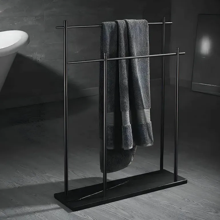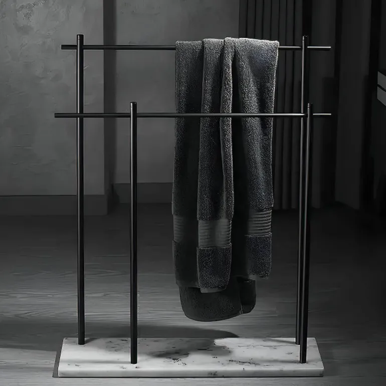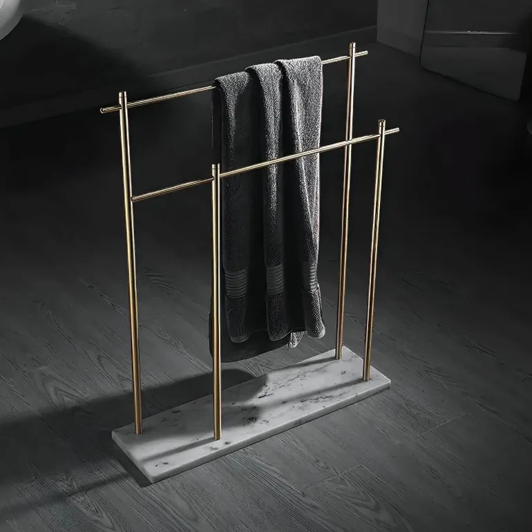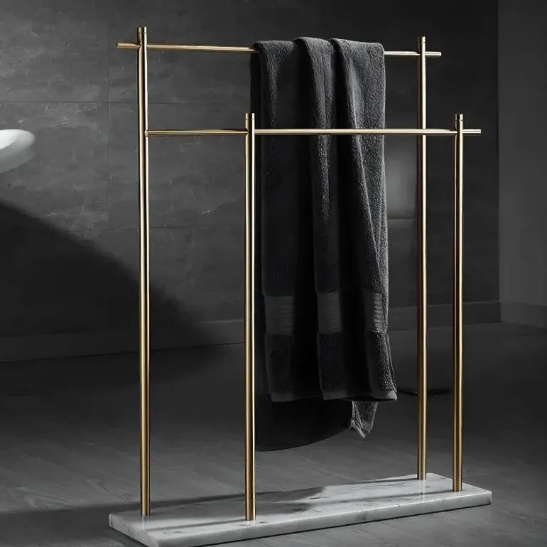 Discover the perfect combination of functionality and elegance with the Caterina Towel Holder, a must-have accessory for your bathroom decor. This stylish piece features a sturdy marble base that adds a touch of luxury to any space. Made from durable copper rods, the towel holder introduces a contemporary charm that beautifully complements modern interiors. Its innovative double design allows for the convenient storage of multiple towels, keeping your bathroom organized and tidy. Experience the seamless blend of practicality and sophistication with this exquisite bathroom accessory that enhances your living environment. Explore more practical solutions for your home at Decor .