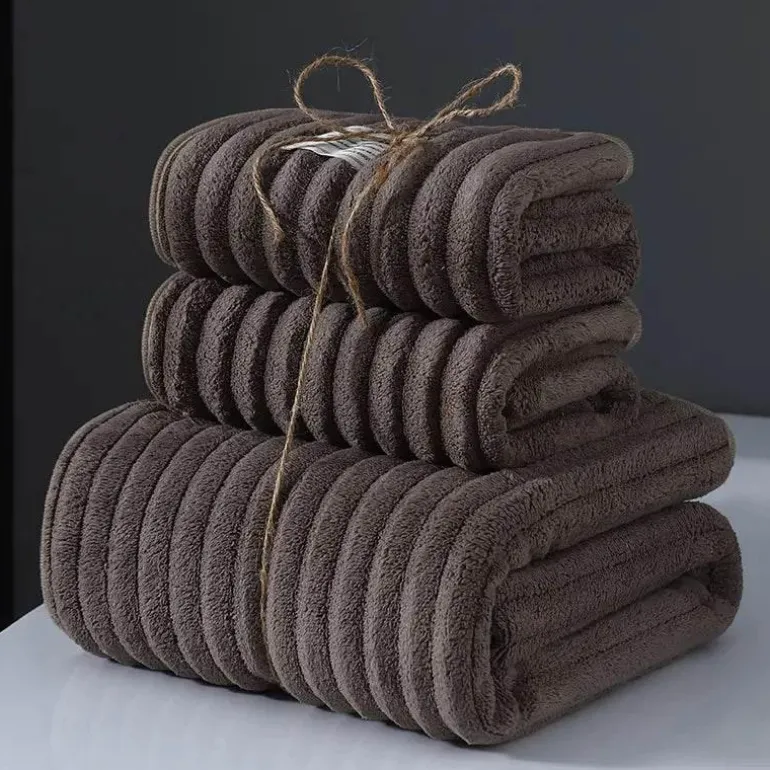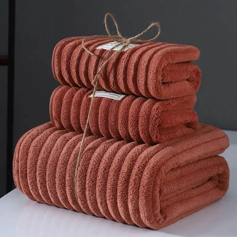 This three-piece set includes a bath towel, hand towel, and face towel, meticulously designed to wrap you in warmth and comfort after every shower or wash. The towels boast a thick surface that effectively absorbs moisture while retaining their soft and fluffy texture, ensuring they remain gentle against your skin.