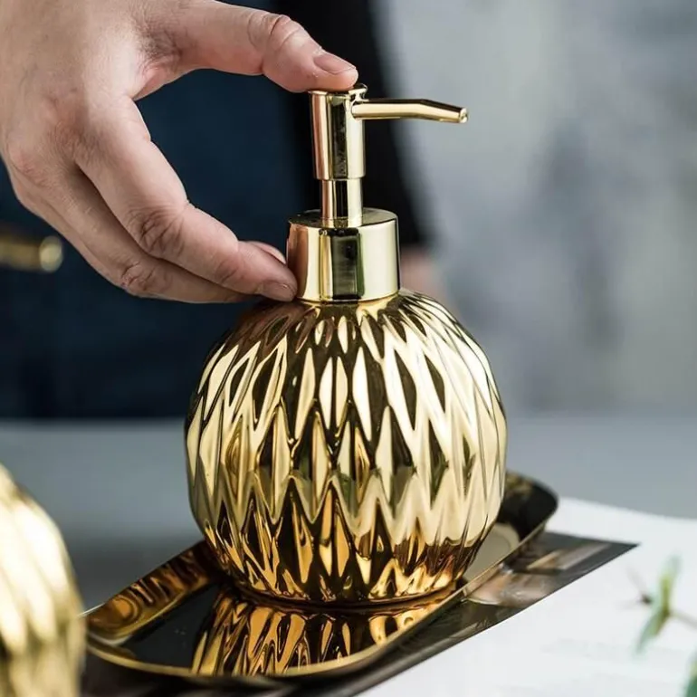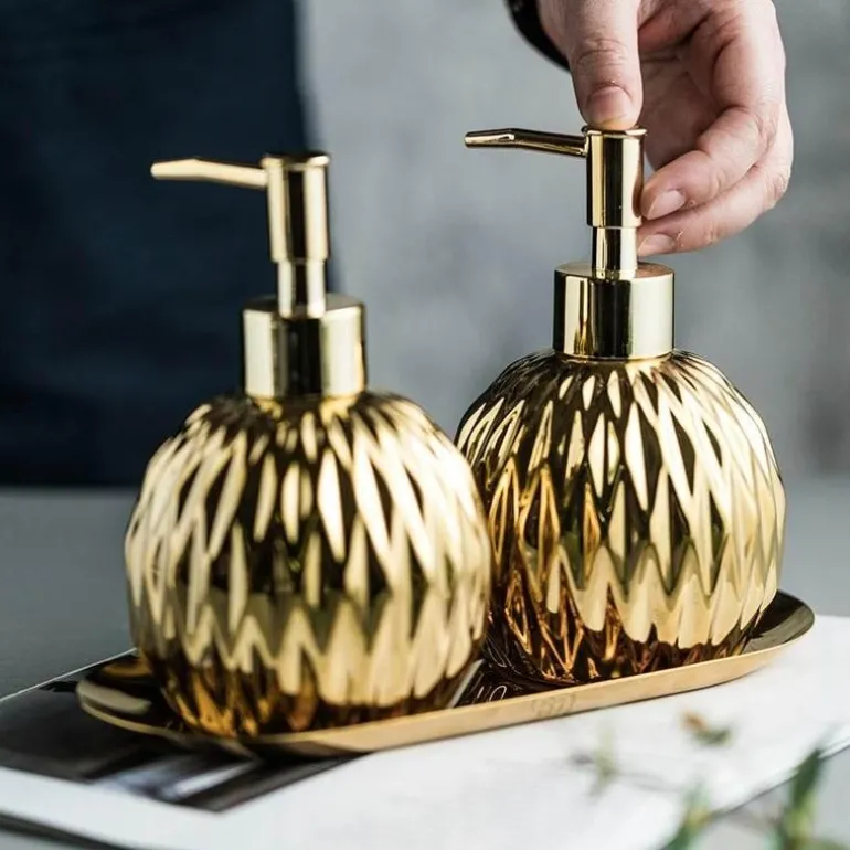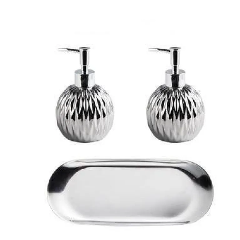 This thoughtfully designed bath accessory set includes two lotion dispensers and a convenient amenity tray, all made from high-quality ceramic to ensure both durability and style. For optimal performance, it is recommended to use only liquid lotion in the dispensers. Maintaining this set is easy; simply wipe the surfaces with a soft cloth dampened with water.