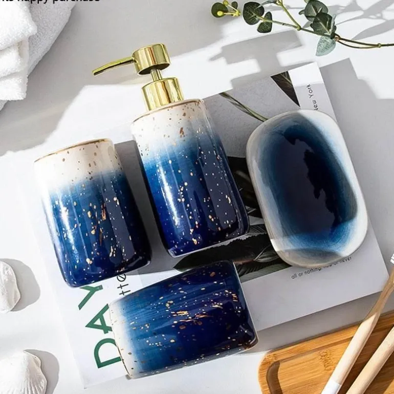 Elevate the aesthetic of your bathroom with the Deep Blue Bathroom Accessories set, a blend of style and functionality that enhances your home décor. This sophisticated 4-piece collection features a sleek teardrop design crafted from durable ceramic, making it the perfect choice for any bathroom, whether in your home, a hotel, or a guest house.