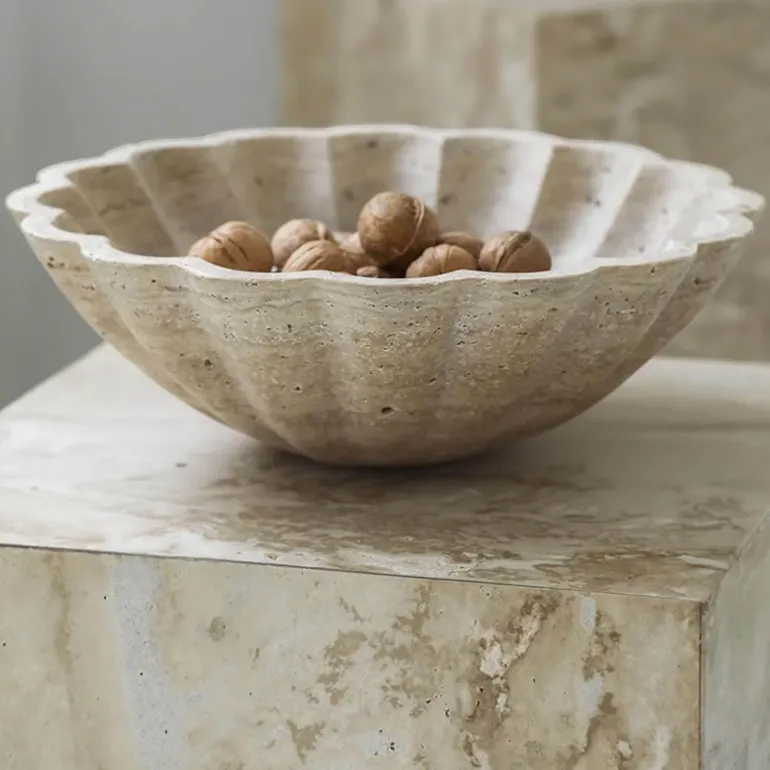 Jede Schale wird sorgfältig von Hand gefertigt, um die einzigartigen Eigenschaften von Travertin hervorzuheben. So erhalten Sie ein einzigartiges Meisterwerk, das die Schönheit der Natur widerspiegelt. Genießen Sie die Ruhe und den Stil, die diese Travertinschale in Ihr Zuhause bringt und sie zu einer durchdachten Ergänzung Ihrer Einrichtung macht.