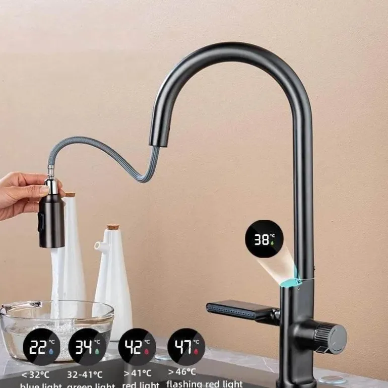 Verschönern Sie Ihr Küchenerlebnis mit dieser stilvollen und praktischen digitalen Küchenarmatur mit fortschrittlichem Temperatursensor. Diese Armatur vereint moderne Technologie mit raffinierter Ästhetik und verfügt über eine digitale Anzeige, die die Wassertemperatur präzise anzeigt. So erreichen Sie mühelos die perfekte Temperatur zum Kochen und Reinigen. Der elegante Wasserfallstrahl strahlt nicht nur Eleganz aus, sondern verbessert auch die Funktionalität Ihrer Spüle.