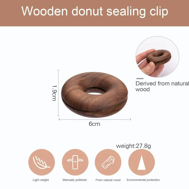 Genießen Sie die Funktionalität und den Charme unserer Donut-Verschlussklammern aus Naturholz – eine umweltfreundliche, gesunde und ungiftige Alternative. Diese Klammern bestehen vollständig aus massiven, organischen Materialien ohne Füllstoffe oder Kunststoff und sind daher langlebig, ohne Bruch oder Verblassen, wie es bei herkömmlichen Kunststoffklammern üblich ist. Sie eignen sich perfekt zum Verschließen verschiedener Lebensmittelbeutel, darunter Chips, Brot, Kaffeebeutel und andere Snacks, und halten Ihre Lebensmittel länger frisch. Dank ihres einzigartigen Designs eignen sie sich zudem als dekoratives Element in Ihrer Küche.