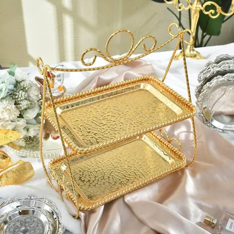 Verschönern Sie Ihre Dessertpräsentation mit unserem durchdachten doppelstöckigen Tortenständer. Er eignet sich ideal für die Präsentation köstlicher Leckereien wie Cupcakes, Gebäck und andere Süßwaren. Der Ständer besticht durch sein unverwechselbares, schwingendes Design, das Ihrer Präsentation eine verspielte Note verleiht und ihn sowohl für private Feiern als auch für gewerbliche Anlässe hervorragend geeignet macht. Ob Geburtstagsfeier, Hochzeitsplanung oder Desserttisch in einer Bäckerei – dieser Tortenständer verleiht jedem Anlass Charme und Kreativität.