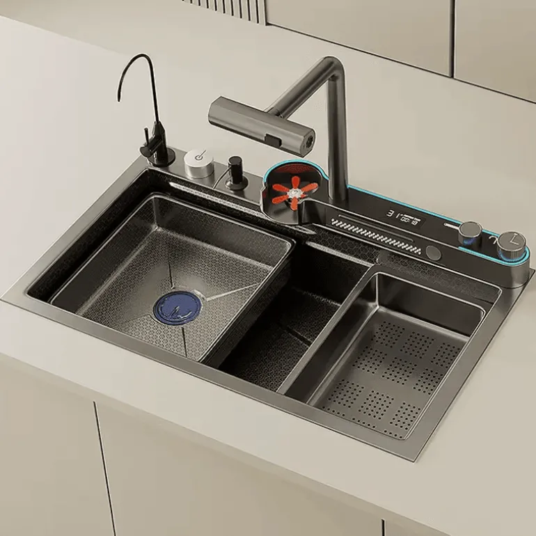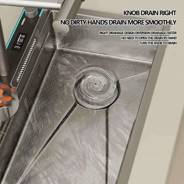 Entdecken Sie die innovative Honeycomb Digital Nano Integrated Edelstahl-Wasserfallspüle, die sowohl die Funktionalität als auch die Ästhetik Ihrer Küche verbessert. Diese moderne Spüle verfügt über einen markanten Wasserfallauslauf, der ein faszinierendes optisches Element darstellt und gleichzeitig einen effizienten Wasserablauf gewährleistet. Die hochmoderne Nanobeschichtung erhöht die Haltbarkeit und macht die Spüle kratz- und fleckenbeständig, sodass sie auch bei täglichem Gebrauch ihr elegantes Aussehen behält.
