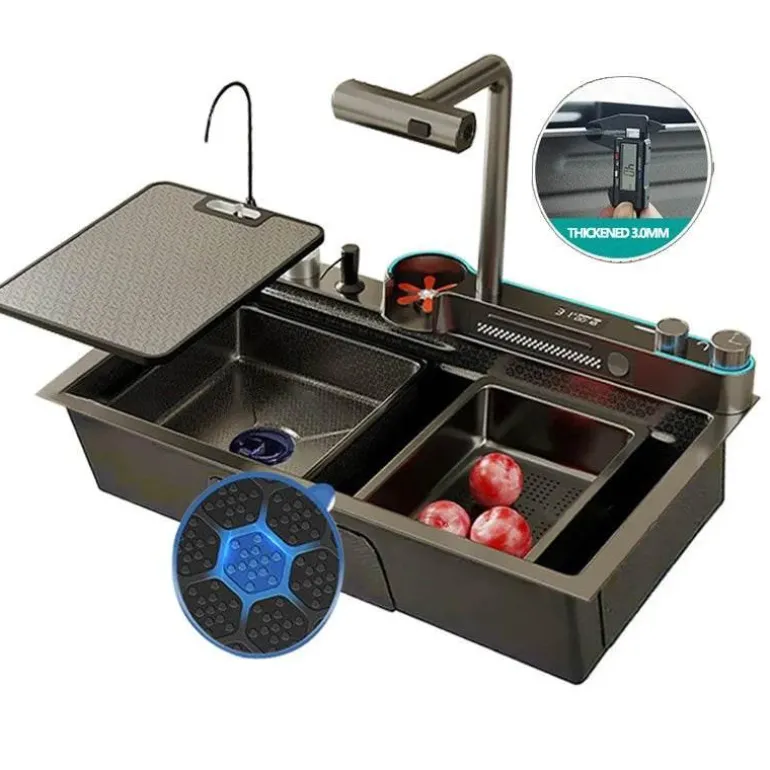 – **Wie schneidet dieses Produkt im Vergleich zu anderen ab?** Im Gegensatz zu herkömmlichen Spülbecken verfügt dieses Modell über erweiterte Funktionen wie einen Wasserfallauslauf und eine integrierte intelligente Waschmaschine und fügt sich gleichzeitig nahtlos in moderne Küchenräume ein.