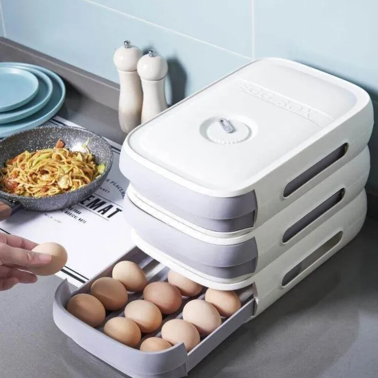 Jede Schublade ist mit einem Gitter ausgestattet und bietet einzelne Fächer, die so geformt sind, dass sie ein einzelnes Ei sicher halten. Dieses Design minimiert das Risiko von Kollisionen zwischen den Eiern und beugt so Beschädigungen vor. Die Stapelbarkeit ermöglicht eine effiziente Anordnung der Schubladen und maximiert so den Stauraum für Ihren täglichen Bedarf.