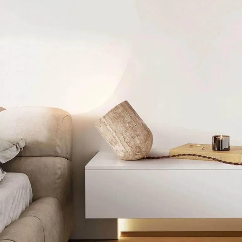 Diese Lampe erhellt nicht nur Ihren Raum, sondern fungiert auch als raffiniertes Dekorationselement. Ihr wunderschön gestalteter Sockel verbreitet ein sanftes und einladendes Licht. Sie verleiht Ihrem Wohnzimmer, Schlafzimmer oder Büro eine gemütliche Note und ist eine markante Ergänzung, die zu vielen Einrichtungsstilen passt. Genießen Sie die natürliche Schönheit von Travertin und werten Sie Ihre Einrichtung mit dieser Lampe auf, die Funktionalität und Ästhetik gekonnt vereint.
