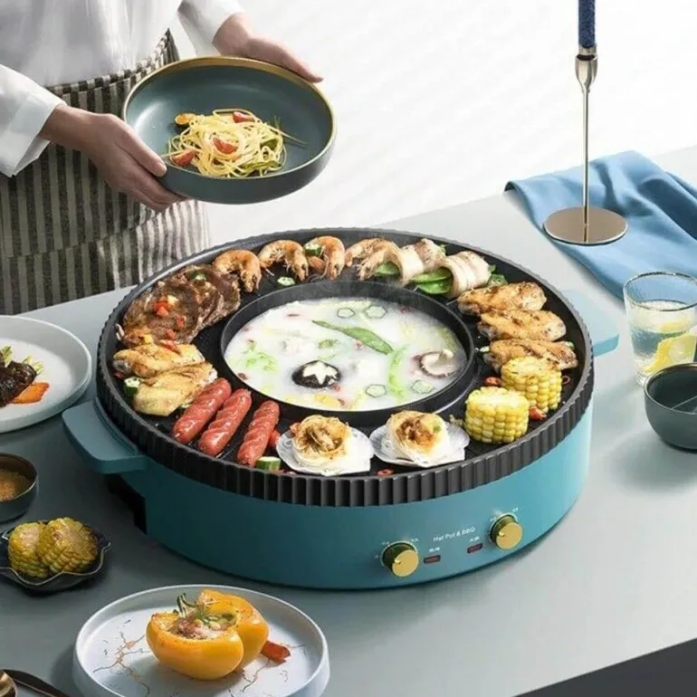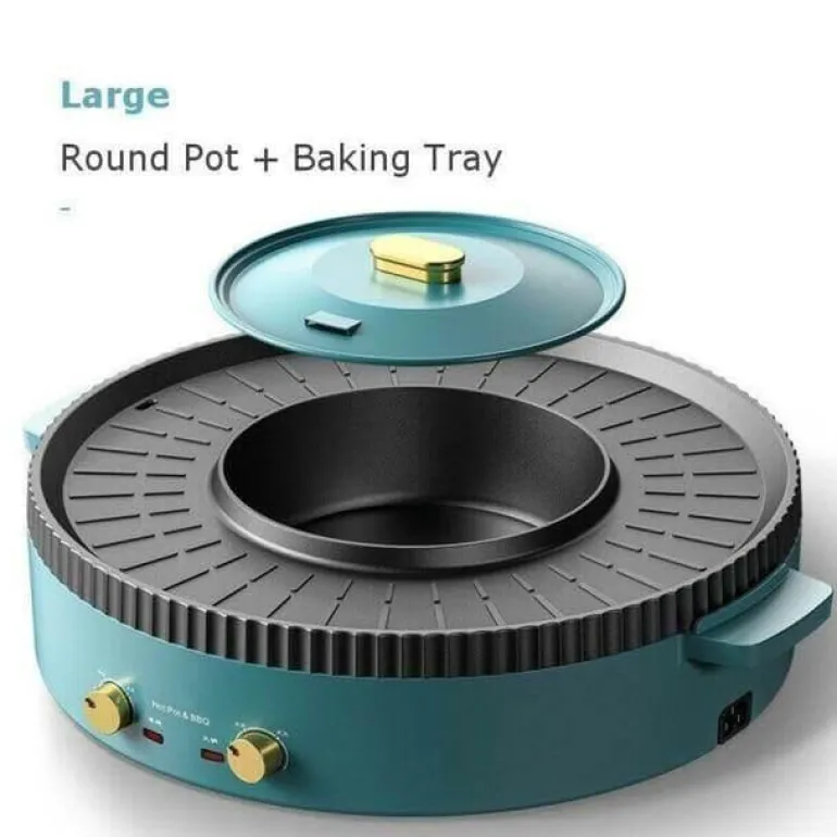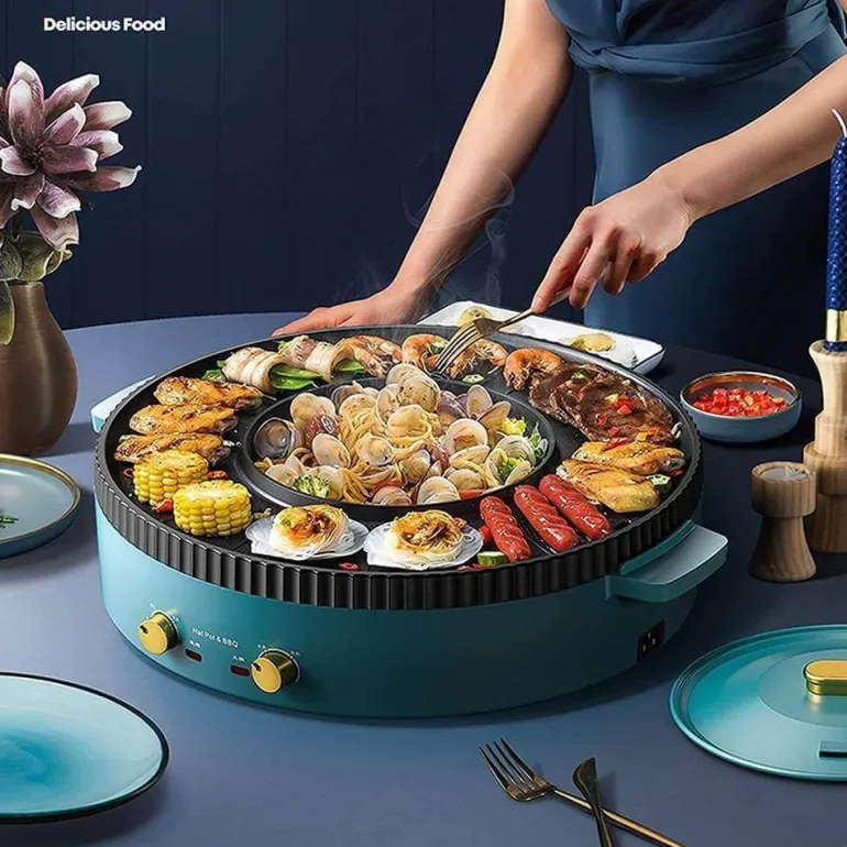 Erleben Sie die Vielseitigkeit unseres elektrischen rauchfreien BBQ-Grills – perfekt für die koreanische Küche. Dieses multifunktionale Gerät verfügt über eine Grillplatte und einen Hot Pot, beide mit unabhängiger Stromversorgung und präziser Temperaturregelung. Dank des Doppelfunktionsdesigns können Sie sowohl grillen als auch im Hot Pot speisen – ein idealer Mittelpunkt für gemütliche Stunden. Die geräumige Backplatte bietet Platz für verschiedene Zutaten wie Fleisch, Gemüse und Meeresfrüchte, während der unterteilte Hot Pot die gleichzeitige Zubereitung zweier verschiedener Geschmacksrichtungen ermöglicht.
