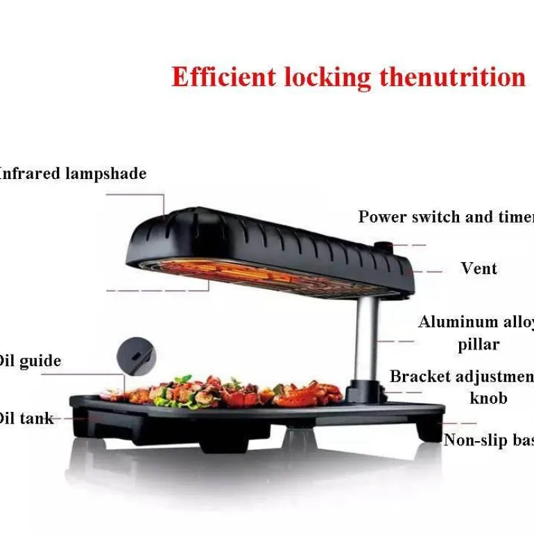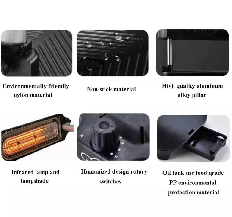 Dieser Grill aus umweltfreundlichem Nylon ist auf Langlebigkeit ausgelegt und verfügt über eine robuste Säule aus Aluminiumlegierung. Sein effizientes Design umfasst eine Infrarotlampe und einen Lampenschirm, die das Kocherlebnis verbessern. Die benutzerfreundlichen Drehschalter sorgen für eine intuitive Bedienung, während die Öltanks aus lebensmittelechtem PP-Material bestehen und so die Sicherheit bei Ihren kulinarischen Abenteuern gewährleisten.