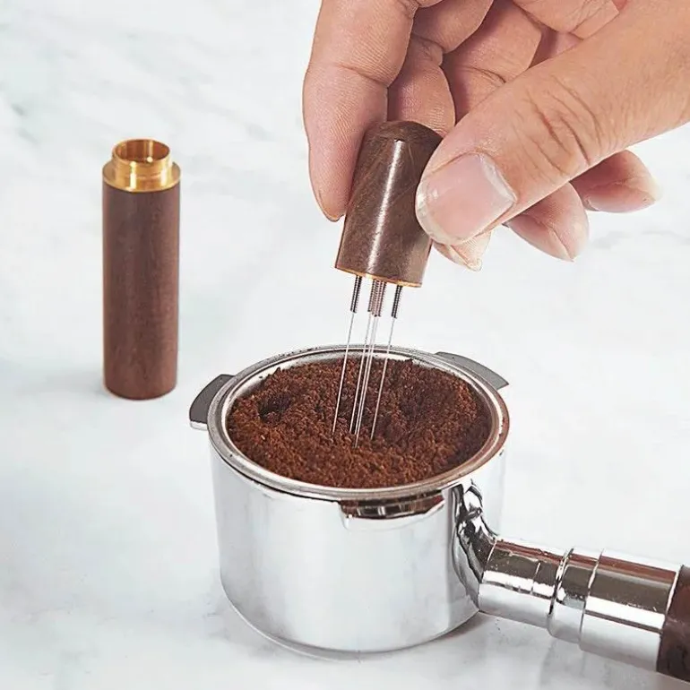 Der Nadelverteiler sorgt für eine gleichmäßige Verteilung des Kaffeepulvers, was für eine optimale Aromaextraktion entscheidend ist. Seine durchdachte Struktur ermöglicht präzises Stampfen und Rühren und vereinfacht so die Zubereitung von reichhaltigem, aromatischem Espresso.