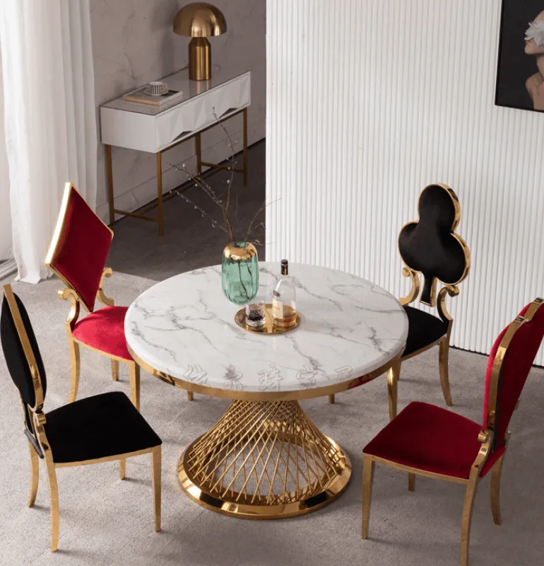 Wenn Sie die Spannung von Kartenspielen lieben, verleiht dieser Esszimmerstuhl aus Edelstahl mit einzigartigem Kartendesign Ihrem Raum einen Hauch von Eleganz. Seine optisch ansprechende Ästhetik wertet nicht nur die Atmosphäre Ihres Raumes auf, sondern begeistert auch Poker- und Gaming-Fans gleichermaßen.