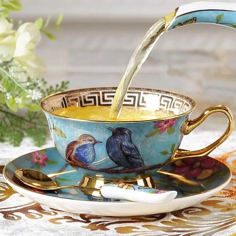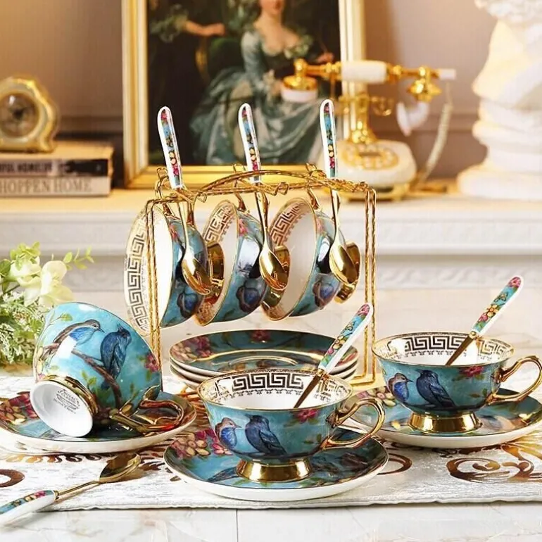 Verschönern Sie Ihre Tee- und Kaffeerituale mit diesem europäischen „Blue Bird“-Set aus Bone China. Es ist sorgfältig für den täglichen Gebrauch und besondere Anlässe gefertigt. Diese beeindruckende Porzellankollektion umfasst elegant gestaltete Tassen, eine charmante Teekanne, eine Zuckerdose und ein Milchkännchen aus hochwertigem Bone China, die Ihr Serviererlebnis veredeln.