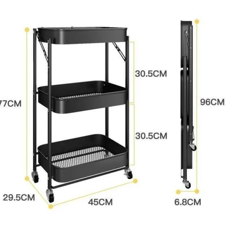 Der Organizer besteht aus robustem Metall, misst im vollständig zusammengebauten Zustand 29,5 cm x 45 cm x 77 cm und lässt sich auf eine kompakte Größe von nur 6,8 cm x 96 cm zusammenfalten.