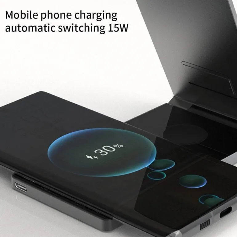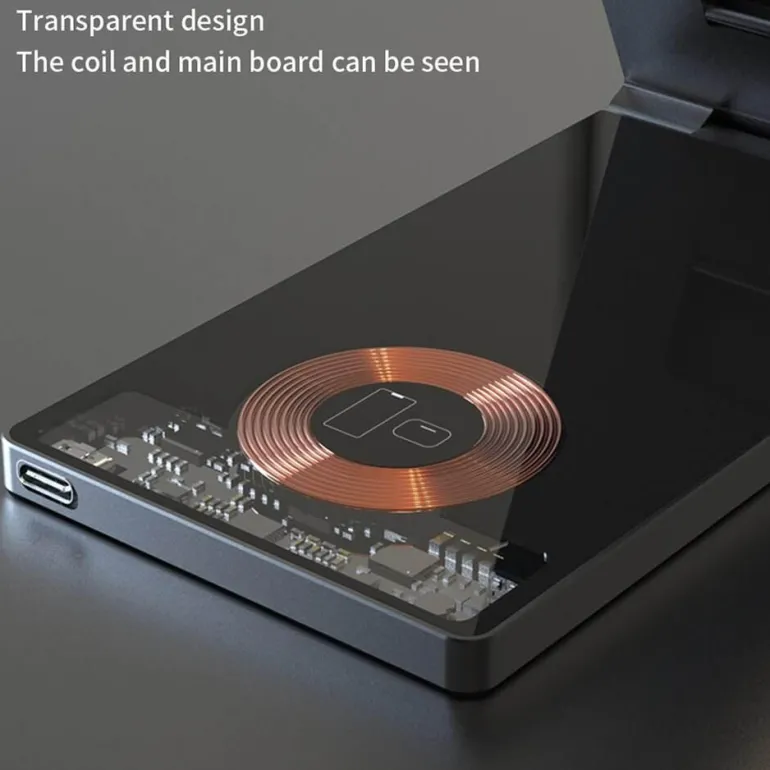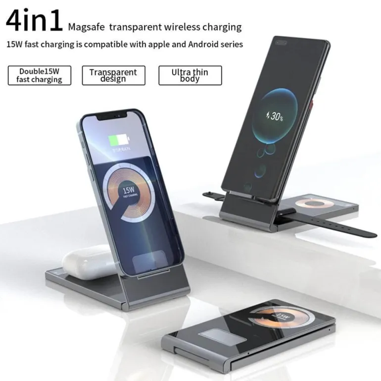 Erleben Sie müheloses Laden mit dem faltbaren magnetischen kabellosen Ladeständer im Clear Beam-Design. Diese innovative Ladelösung macht Schluss mit mehreren Ladegeräten und Kabelsalat und ist ideal für einen übersichtlichen Raum. Er ist für eine Vielzahl von Geräten geeignet, darunter Smartphones, Smartwatches und Ohrhörer, und ermöglicht das gleichzeitige Laden von bis zu vier Geräten. Die magnetische Funktion sorgt dafür, dass Ihre Geräte sicher an ihrem Platz bleiben und sorgen für ein sicheres Ladeerlebnis.