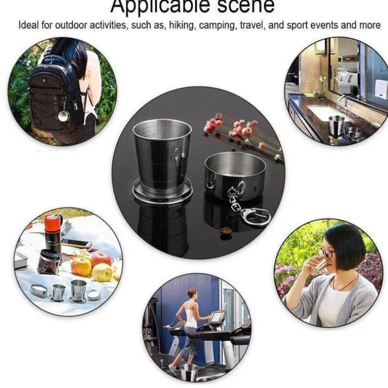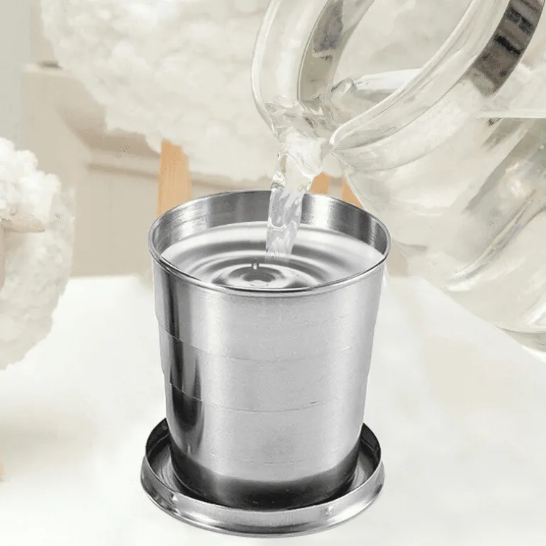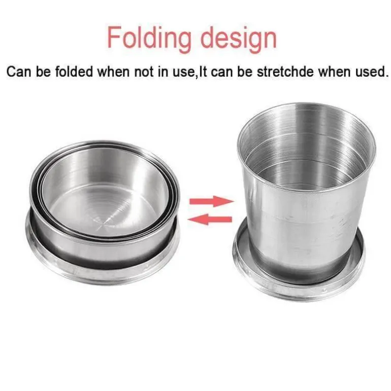 Mit diesem tragbaren und zusammenklappbaren Campingbecher aus Edelstahl bleiben Sie bei Ihrem nächsten Abenteuer stets hydriert. Er ist praktisch und lässt sich leicht auf einen Bruchteil seiner Größe komprimieren, sodass er sich problemlos in der Tasche oder Handtasche transportieren lässt. Dieser vielseitige Faltbecher ist ein unverzichtbares Reiseaccessoire für Outdoor-Fans und begleitet Sie problemlos auf Wanderungen, Campingausflügen oder Picknicks.