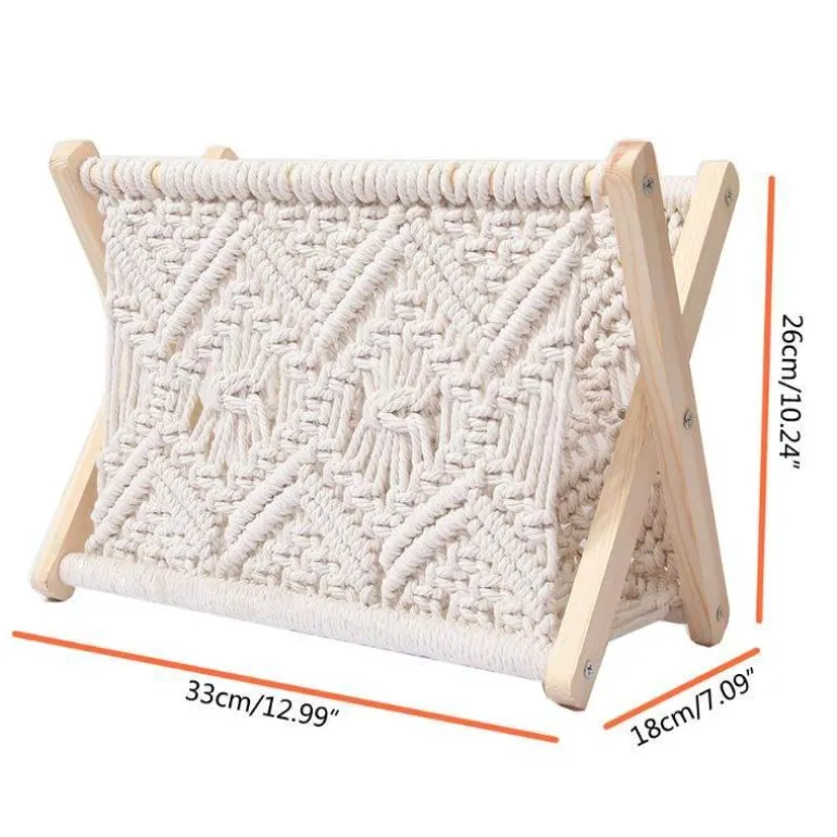 Dieser elegante Mini-Zeitschriftenständer aus Makramee wertet jeden Raum auf – ob Wohnzimmer, Schlafzimmer, Badezimmer, Kinderzimmer oder Büro. Platzieren Sie ihn einfach neben einem Stuhl oder Beistelltisch, um Ihre Lieblingsbücher, Zeitungen, Zeitschriften, Schals und andere Gegenstände übersichtlich und griffbereit aufzubewahren.