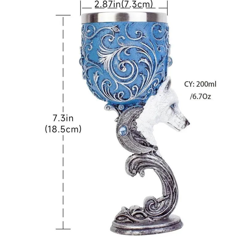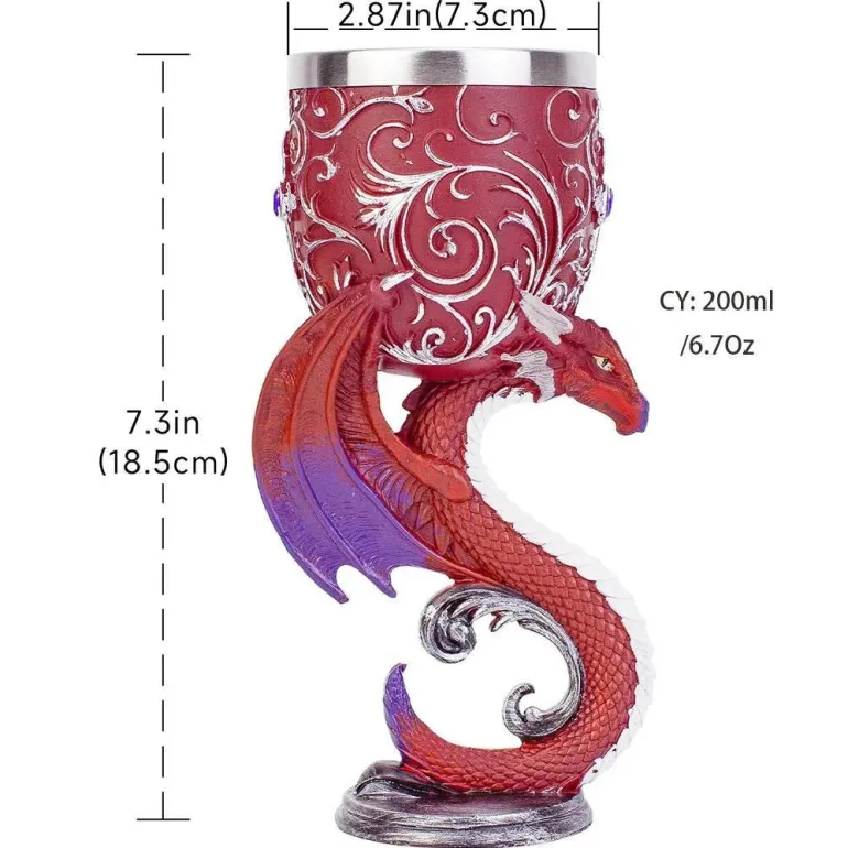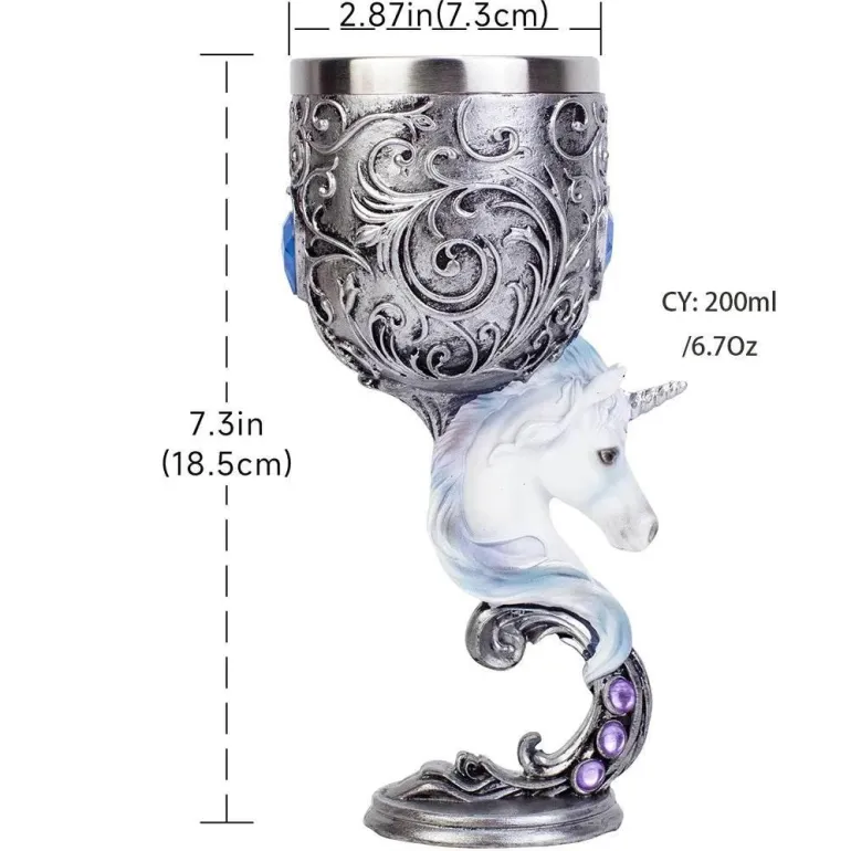 Betreten Sie eine faszinierende Fantasiewelt mit diesem exquisiten Harzkelch, wunderschön gefertigt mit filigranen Motiven von Fabelwesen wie Einhörnern, Drachen und Wölfen. Mit einem großzügigen Fassungsvermögen von ca. 200 ml ist dieses unverwechselbare Weinglas aus robustem Edelstahl gefertigt und ermöglicht Ihnen, Ihre Lieblingsgetränke mit einem Hauch von Eleganz zu genießen.