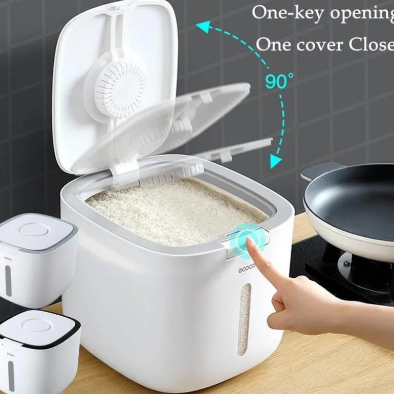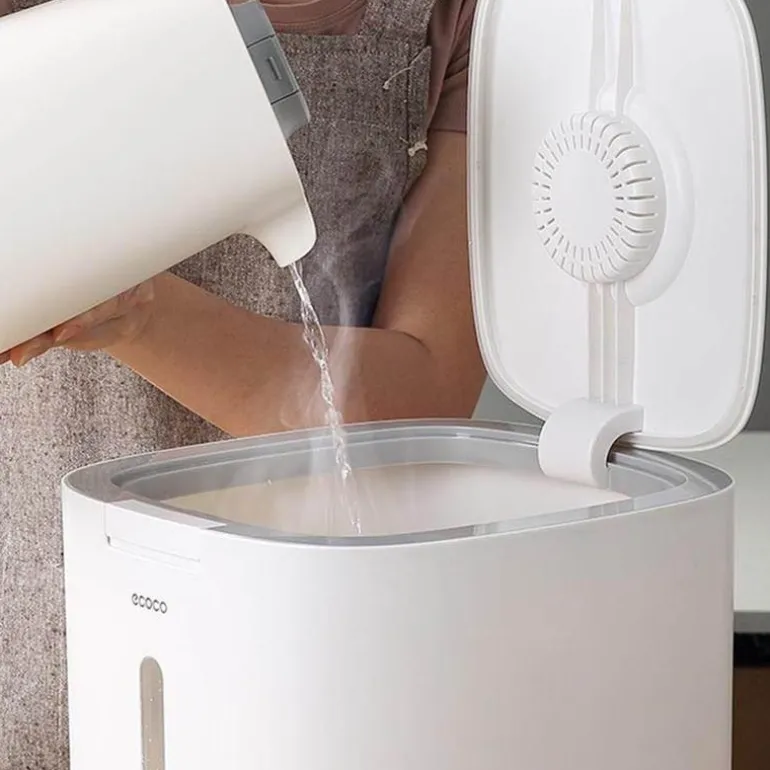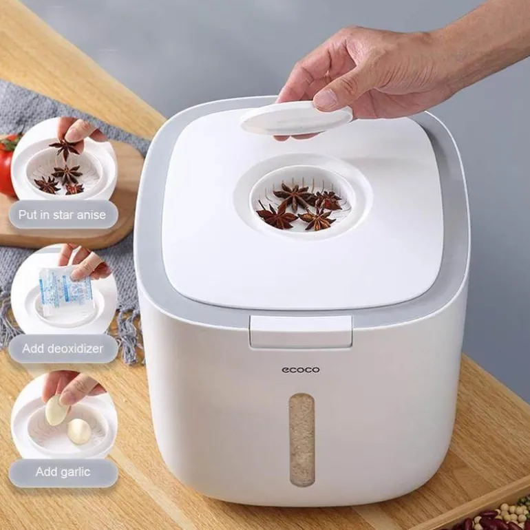 Der feuchtigkeitsbeständige Getreidebehälter ist fachmännisch gefertigt, um Ihre Lebensmittel trocken, frisch und sauber zu halten. Sein zuverlässiger, dichter Verschluss verhindert effektiv die Kontamination durch Bakterien und Feuchtigkeit und sorgt dafür, dass Ihr Getreide länger in optimalem Zustand bleibt.