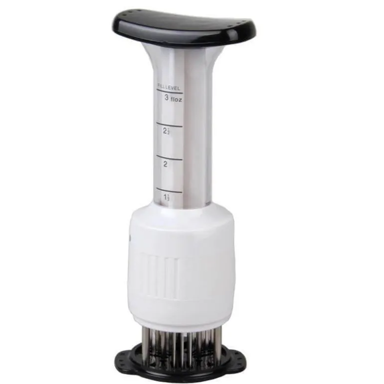 Verbessern Sie Ihr kulinarisches Erlebnis mit unserem Filet-Injektor zum Marinieren von BBQ-Gerichten. Dieses innovative Werkzeug verfügt über einen integrierten Kolben, der die Marinade über drei nadelartige Applikatoren effizient in Ihr Fleisch abgibt. So sorgen die geschmacksverstärkenden Zutaten dafür, dass das Innere Ihres Grillguts schnell durchdringt.