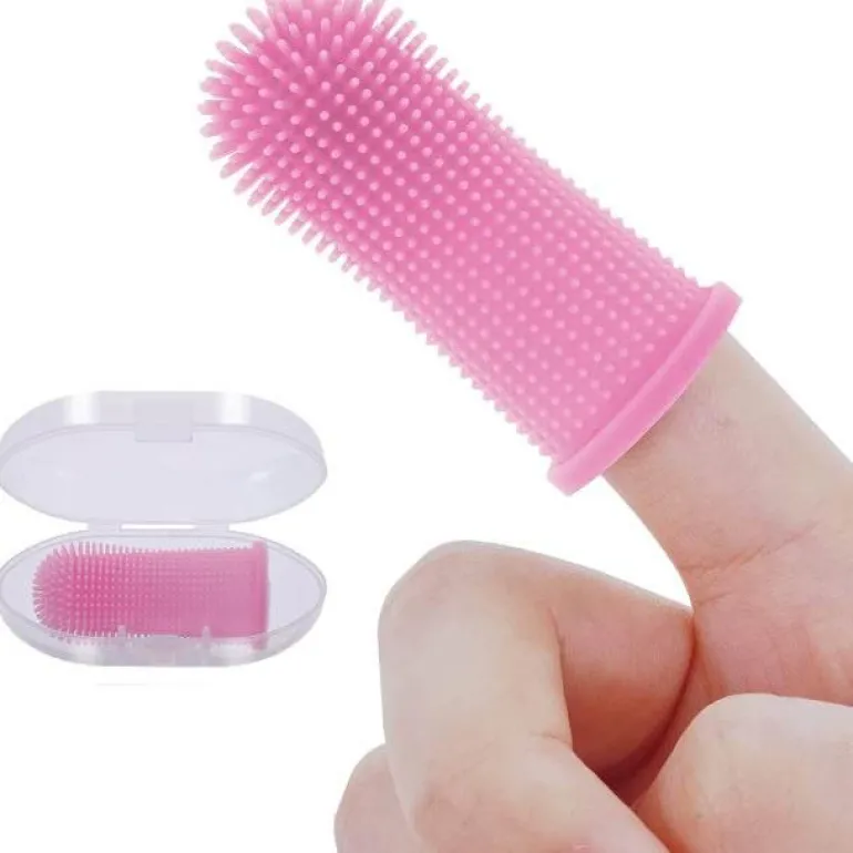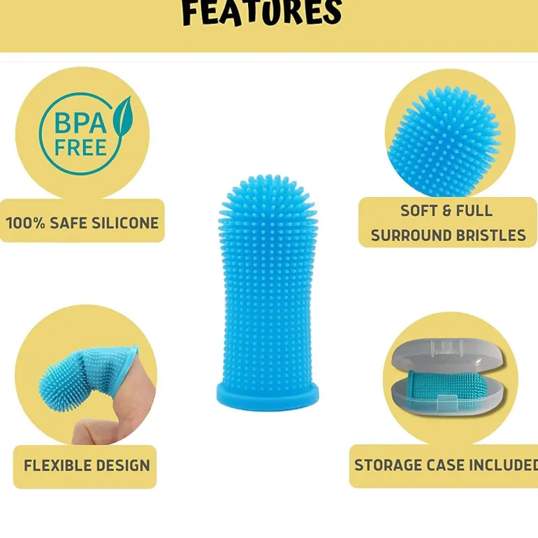 Die Zahnbürste verfügt über ein flexibles Design, das bequem auf die meisten Finger passt und die Verwendung im Vergleich zu herkömmlichen Fingerzahnbürsten, die umständlich sein können, einfacher macht.
