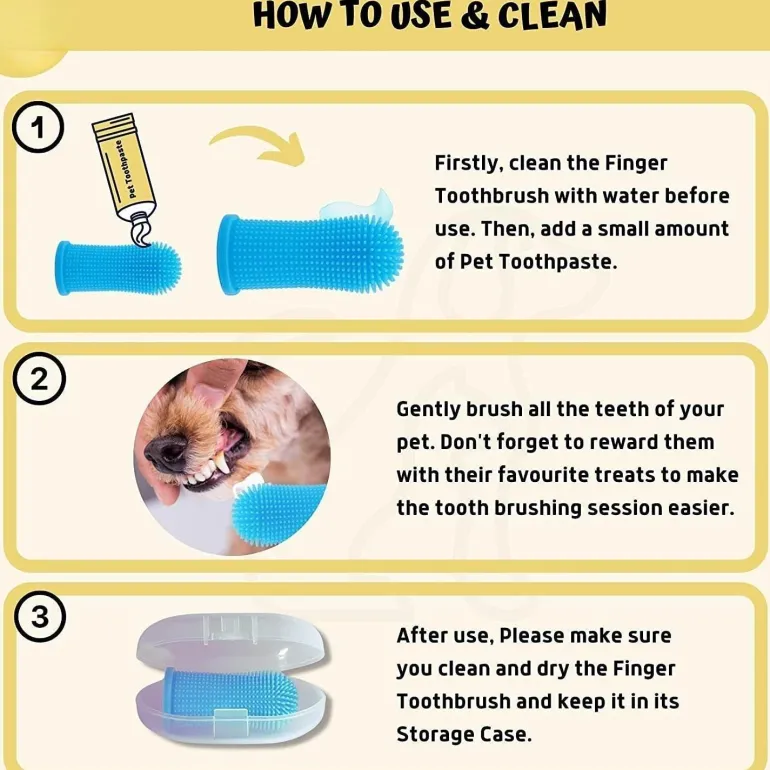 Zahnhygiene ist für Haustiere – Hunde und Katzen – genauso wichtig wie für Menschen. Plaquebildung kann zu ernsthaften, möglicherweise irreversiblen Zahnproblemen führen. Regelmäßiges Zähneputzen, wie von Tierärzten empfohlen, trägt entscheidend zur Vorbeugung dieser Erkrankungen bei. Diese Fingerzahnbürste wurde speziell entwickelt, um Zahnstein- und Plaquebildung zu reduzieren, Parodontitis vorzubeugen und den Atem Ihres Haustieres frisch zu halten.