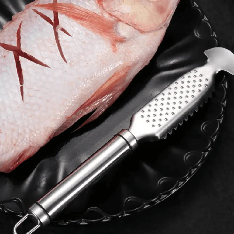 Dank seiner ergonomischen Form liegt der Schaber gut in der Hand und erleichtert das Schuppen von Fisch. Dank seiner scharfen Kanten entfernt der Schaber effektiv Schuppen und schützt gleichzeitig die empfindliche Haut des darunterliegenden Fisches. Dieses Werkzeug eignet sich sowohl für Profiköche als auch für Hobbyköche und vereinfacht die Zubereitung verschiedener Fischgerichte.