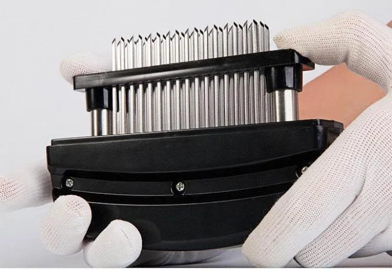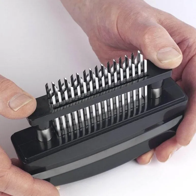 Mit ultrascharfen Edelstahl-Nadelklingen schneidet dieses Gerät mühelos selbst zähe Fleischstücke und ermöglicht Ihnen die Zubereitung köstlicher, appetitanregender Gerichte zu einem Bruchteil der Kosten einer Profiküche. Verwandeln Sie Ihre zähen Stücke in Sekundenschnelle in zarte Steaks.