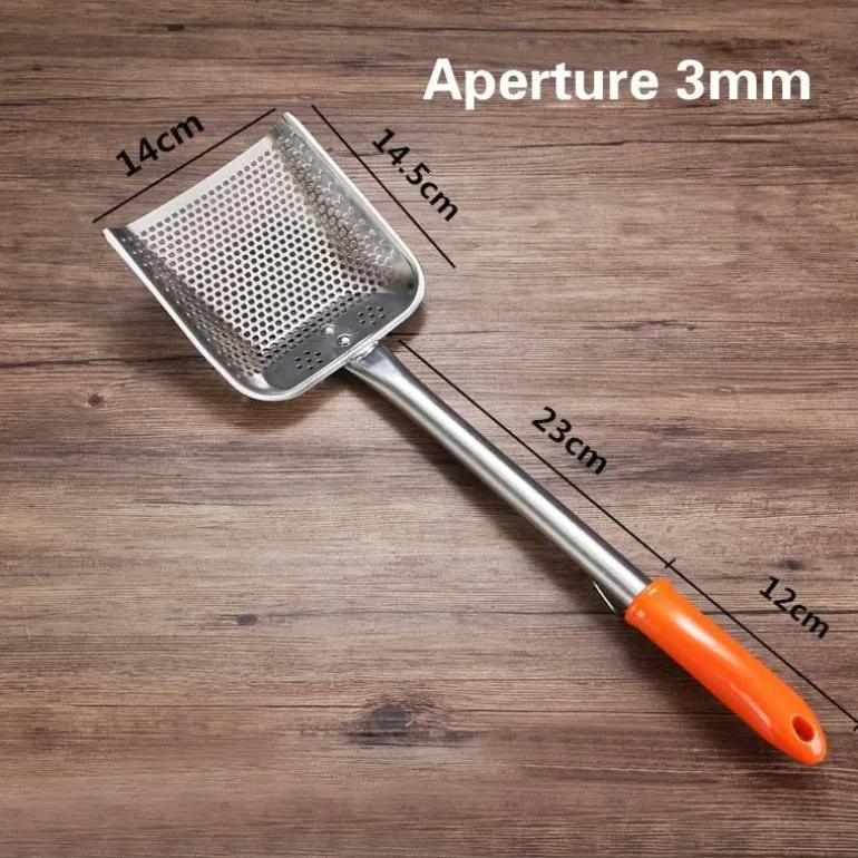 Erleben Sie die Multifunktionalität unseres Edelstahlspatels, der speziell zum Braten und Abtropfen Ihrer Lieblingsgerichte entwickelt wurde. Dieses unverzichtbare Kochwerkzeug aus hochwertigem Edelstahl verfügt über einen langen Griff, der Ihre Hände sicher vom heißen Öl fernhält. Der breite, geschlitzte Kopf eignet sich ideal zum mühelosen Wenden und Anheben verschiedenster frittierter Speisen, von knusprig goldbraunen Pommes bis hin zu perfekt gegartem Hähnchen.
